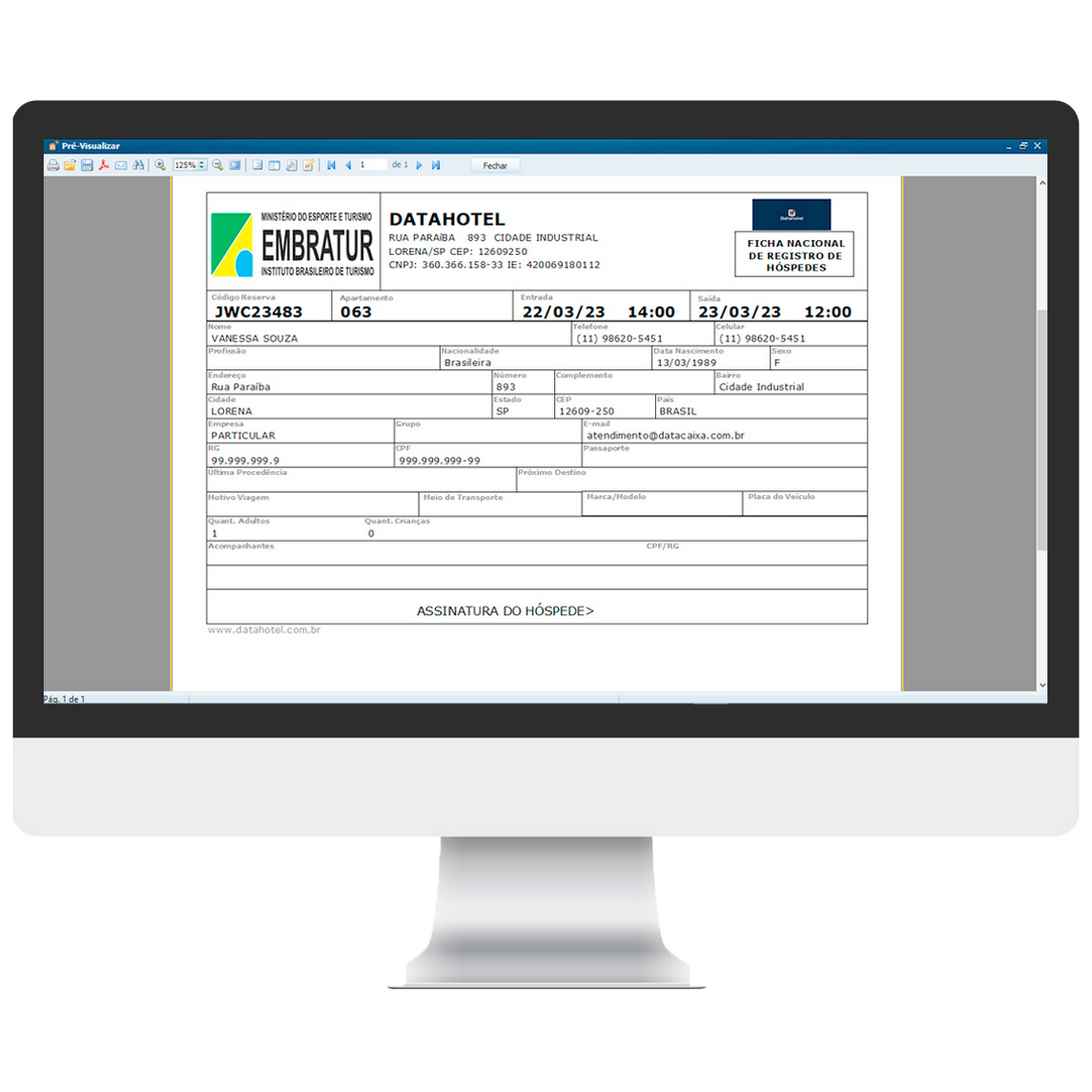 Impressão da Ficha Nacional de Registro de Hóspedes (FNRH – EMBRATUR) com os dados do Hóspede para agilizar o Check-in.
