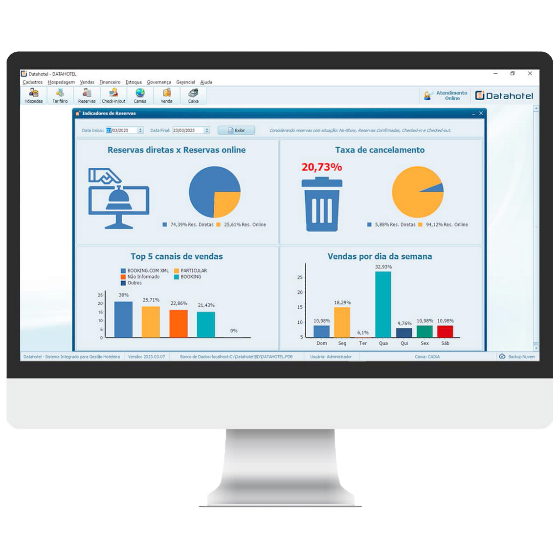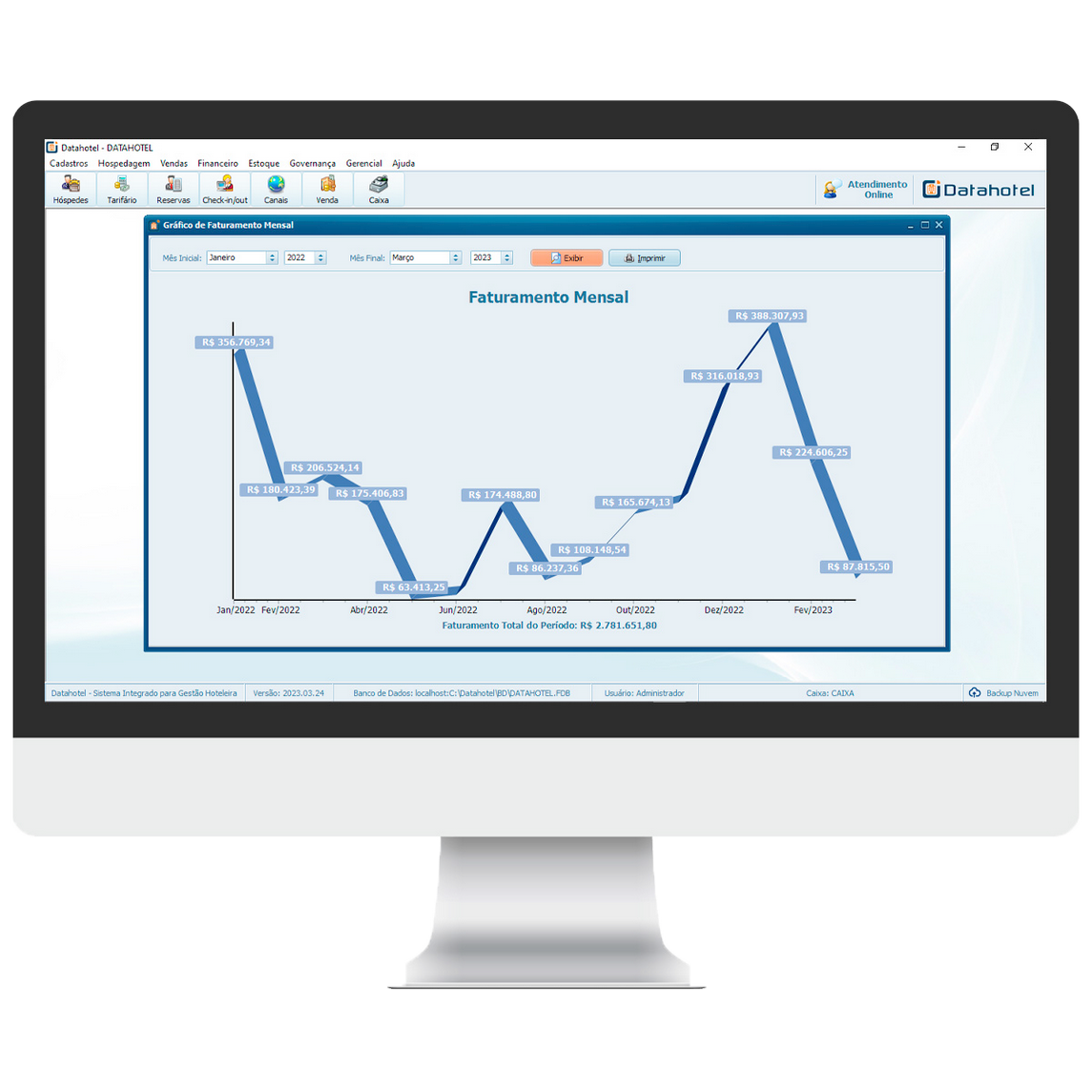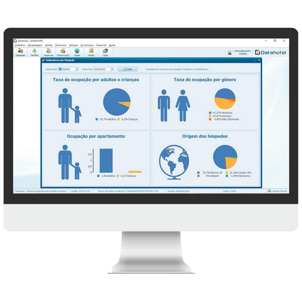 O Sistema oferece diversos Relatórios e Gráficos para análises gerenciais, como Taxa de Ocupação, Indicadores de Performance (KPI’s, REVPAR, TREVPAR) e Gráficos de Faturamento.