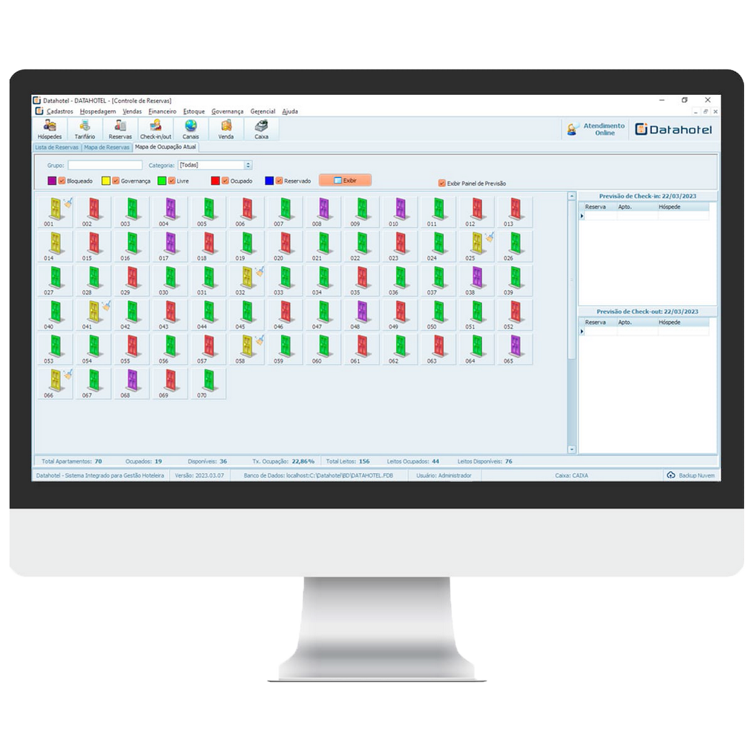 Controle eficiente de todos processos de um Hotel. Desde o lançamento da Reserva, Check-in, Check-out, Governança, Contas a Receber, Contas a Pagar, Controle de Estoque e muito mais!