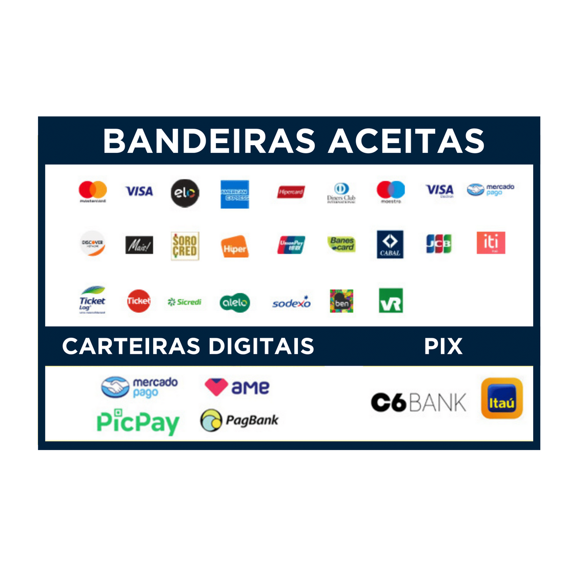 (Visa, Mastercard, Elo, American Express, Sodexo, Vale Alimentação/Refeição, etc.).